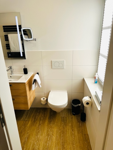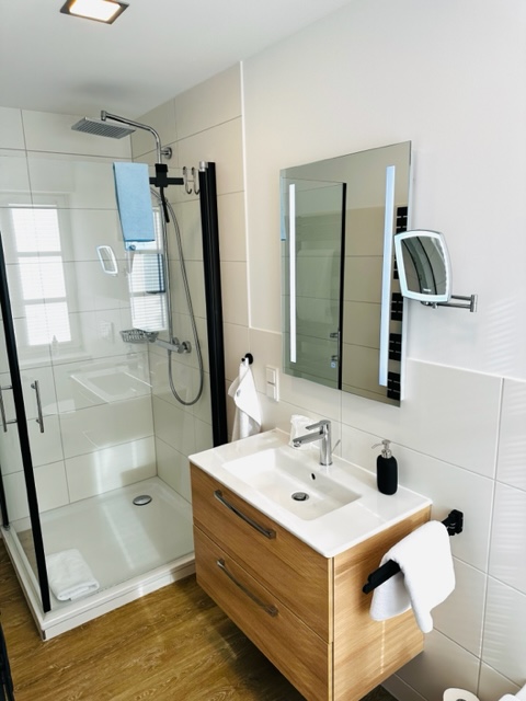 Das Bad erreicht man direkt aus dem Schlafzimmer und ist modern und komfortabel eingerichtet. Ideal Standard Möbel-Waschtisch, Dusche mit Glaskabine und Hansgrohe Thermostatarmatur mit Rainshower-Duschkopf, Toilette: Villeroy & Boch O.novo, Design-Handtuchheizkörper, Kosmetikspiegel sowie Fön.