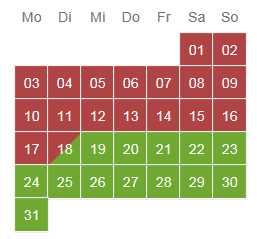 Weiterhin werden im Buchungsportal zu den Kammern und dem Apartment ein "Übersichtskalender" angezeigt, wo Ihnen die verfügbaren Zeiten farblich dargestellt angezeigt werden.